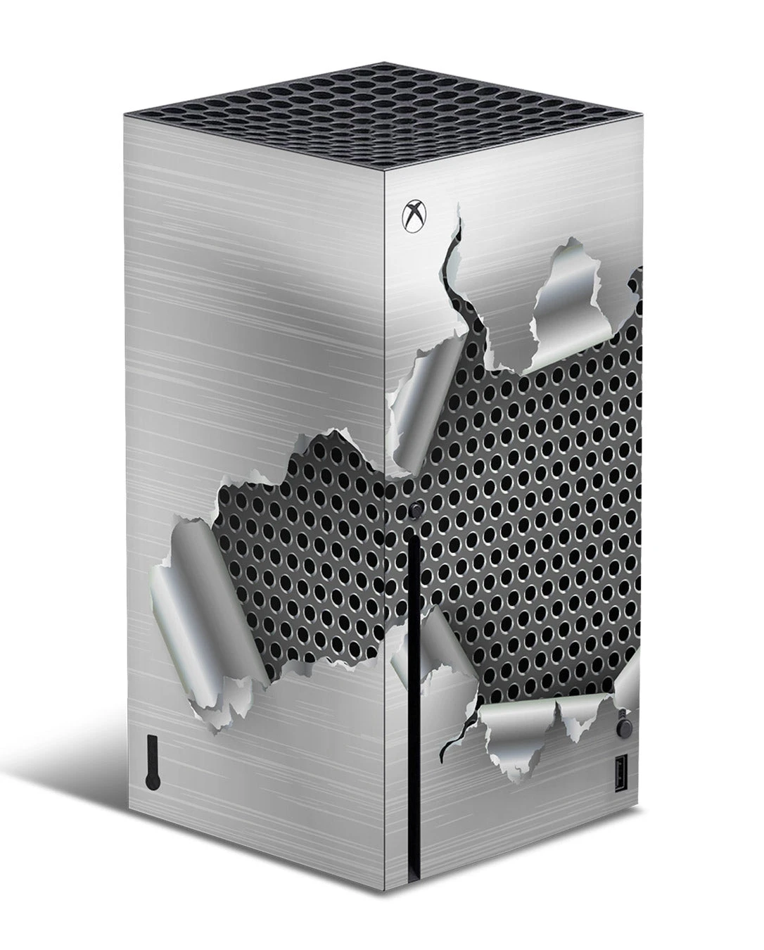 Transform the look of your Xbox Series X with our brushed metallic (and very ripped apart) Breaking Through console wrap! GameVinyl console skin stickers for Xbox Series X are made in the USA and protect your console from scratches, dust and stains while making it look absolutely awesome.