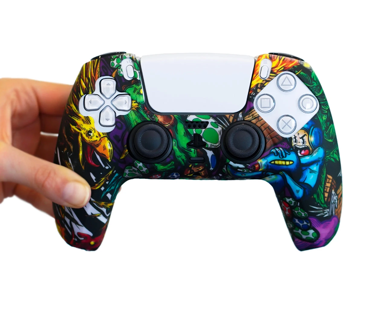 Hand drawn, colored and shaded, this original piece of art commissioned exclusively for VGF Gamers has been brought to life on your PS5 DualSense. This silicone controller skin features an abstract rendition of characters inspired by some of your favorite games.