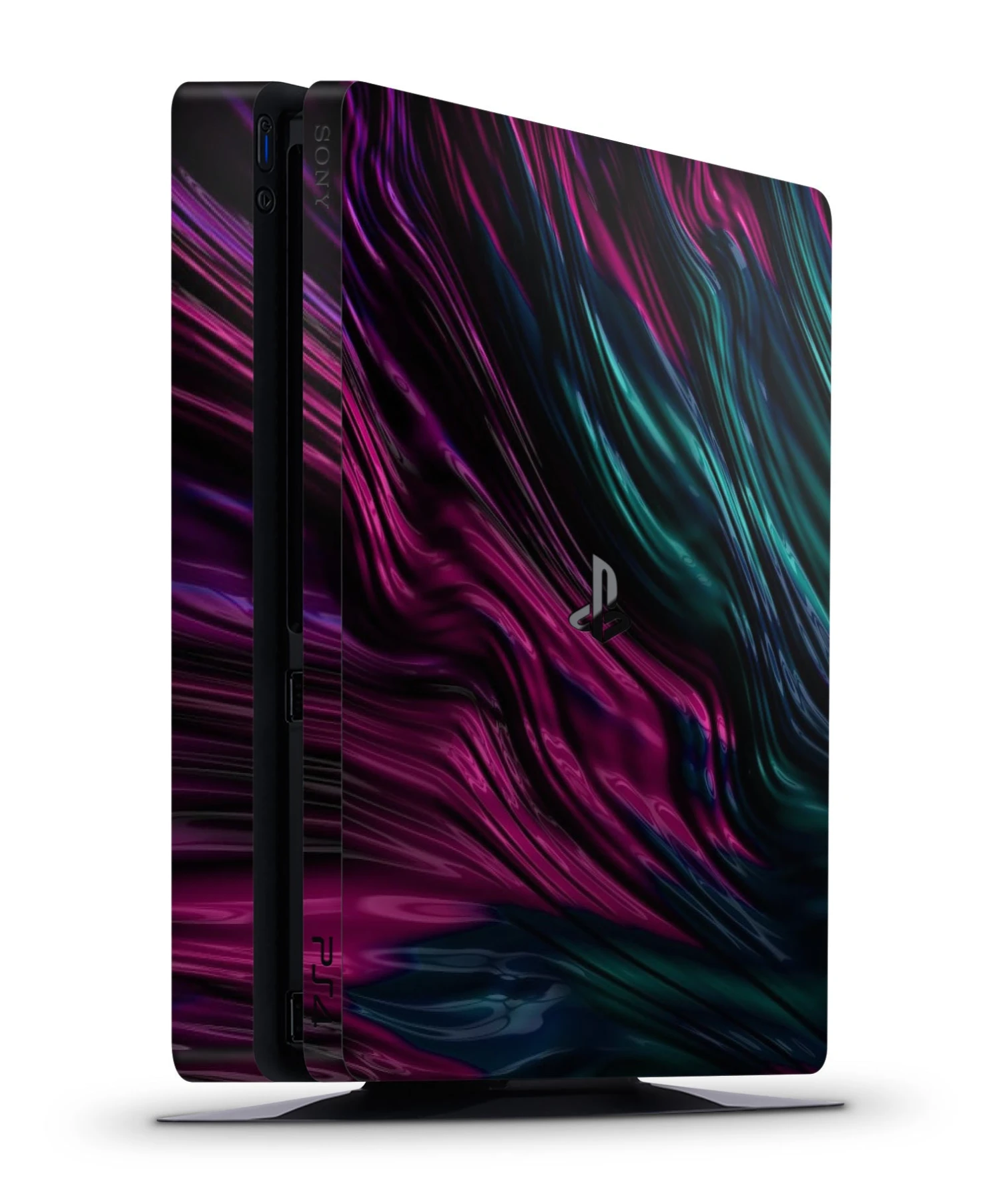 Transform the look of your Sony PS4 Slim console with Matter of Essence, featuring an abstract flow of greens, purples and pinks. GameVinyl console covers, wraps and decals for PlayStation 4 Slim are made in the USA and protect your console from scratches, dust and stains while making it look absolutely awesome.